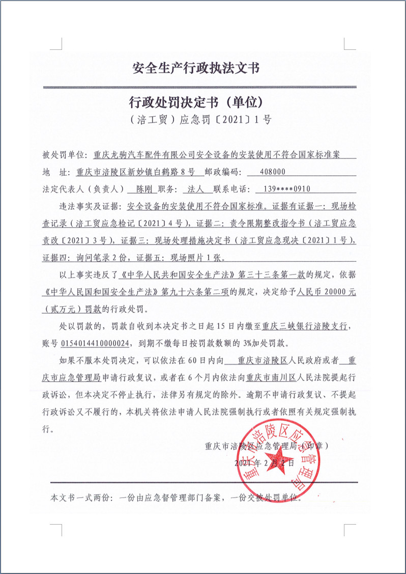 重庆龙驹汽车配件有限公司行政处罚决定