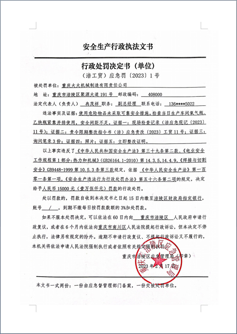 重庆大大机械制造有限责任公司行政处罚决定