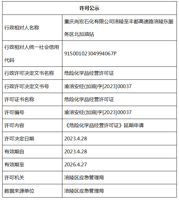 重庆尚宏石化有限公司涪陵至丰都高速路涪陵东服务区北加油站行政许可