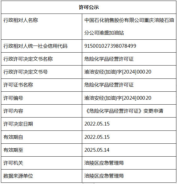 中国石化销售股份有限公司重庆涪陵石油分公司渝盛加油站行政许可