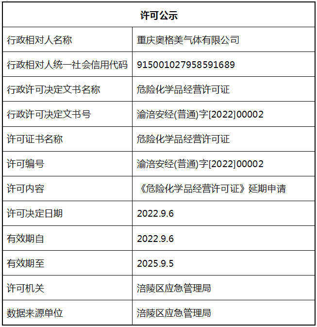 重庆奥格美气体有限公司行政许可