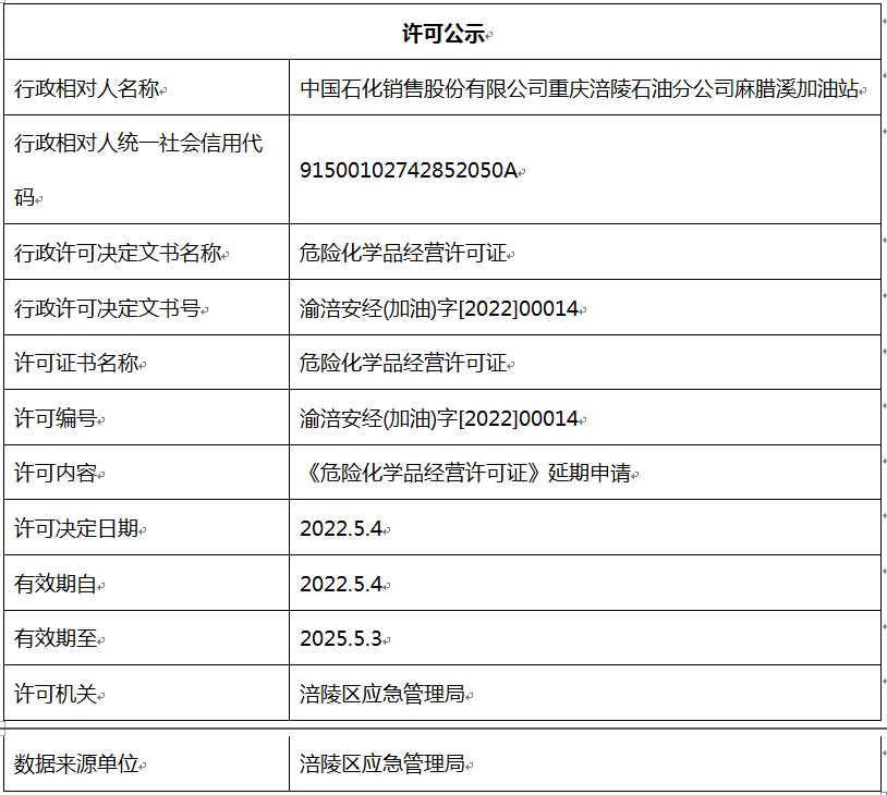 重庆涪陵石油分公司麻腊溪加油站行政许可