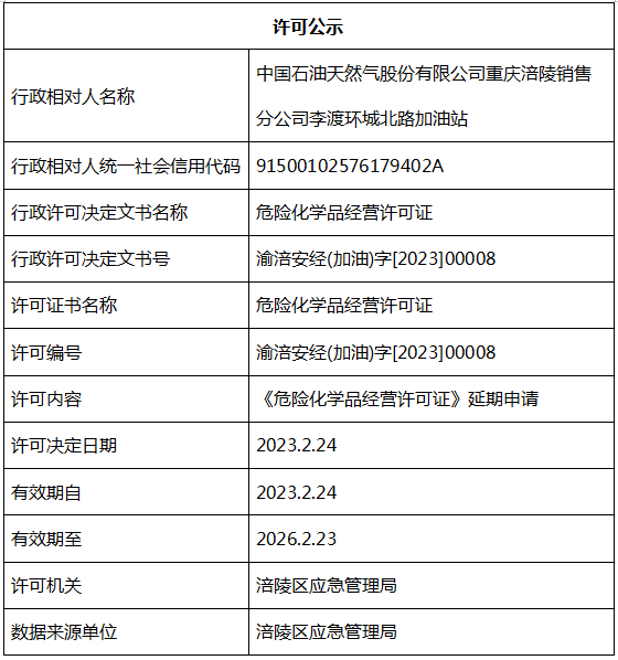 中国石油天然气有限公司重庆涪陵销售分公司李渡环城北路加油站行政许可