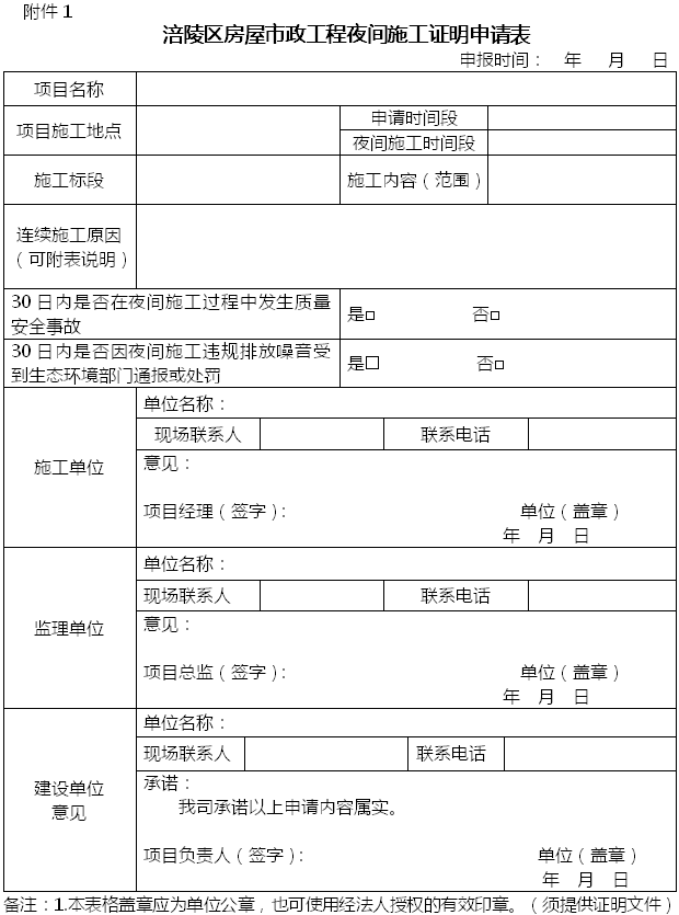 (一)《涪陵区房屋市政工程夜间施工证明申请表》(见附件1);