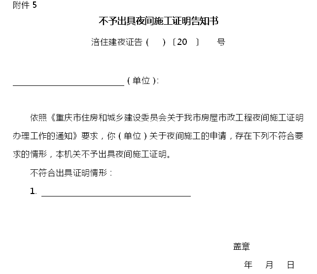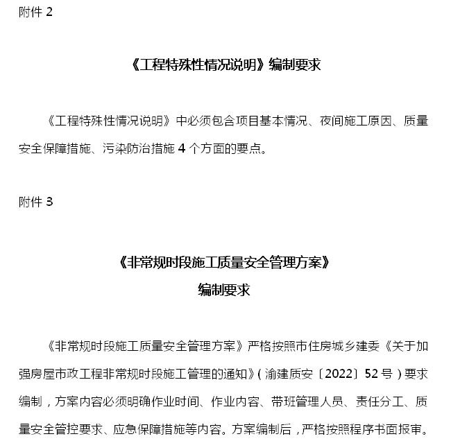 (二)市住房城乡建委《关于我市房屋市政工程夜间施工证明办理工作的通知》(渝建质发〔2023〕1号)。