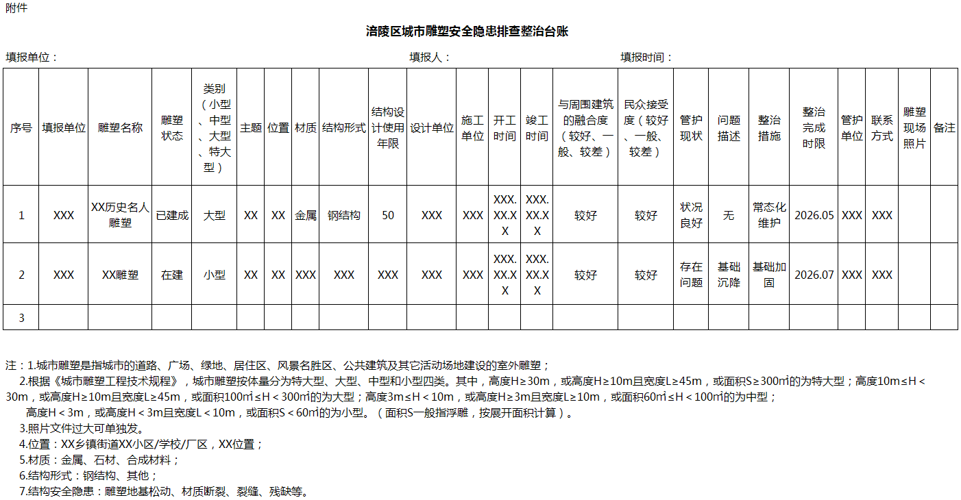 请各行业主管部门及相关单位严格按照排查整治情况与责任划分结果,如实、完整填写《城市雕塑安全隐患排查整治台账》(见附件),于2026年4月24日(星期五)前,将该台账的电子版及盖章扫描件通过渝快政报送至区住房城乡建委-设计与绿色建筑发展科。联系人:杨易,联系电话:023-72379392。