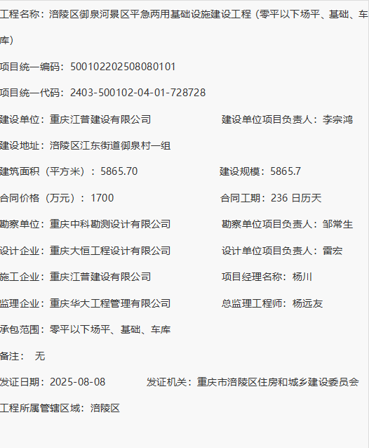 涪陵区御泉河景区平急两用基础设施建设工程(零平以下场平、基础、车库) 建筑工程施工许可