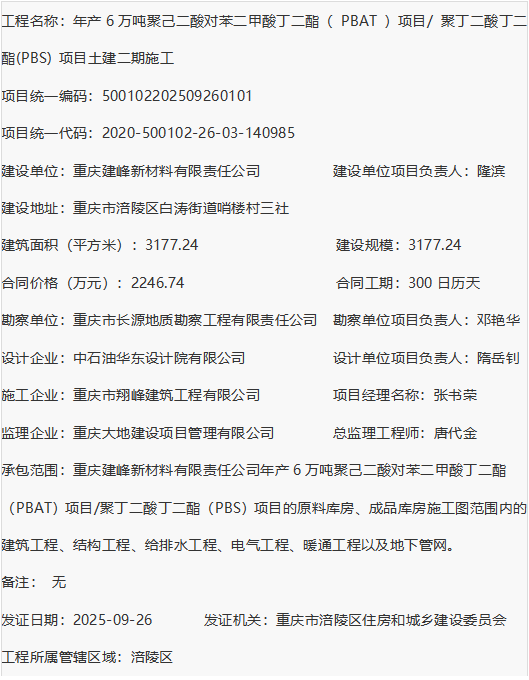 年产6万吨聚己二酸对苯二甲酸丁二酯( PBAT )项目/ 聚丁二酸丁二酯(PBS) 项目土建二期施工 建筑工程施工许可