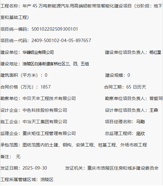 年产45万吨新能源汽车用高端铝板带箔智能化建设项目(分阶段:地下室和基础工程) 建筑工程施工许可
