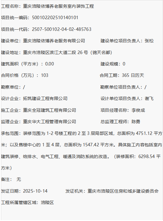 重庆涪陵依博养老服务室内装饰工程 建筑工程施工许可