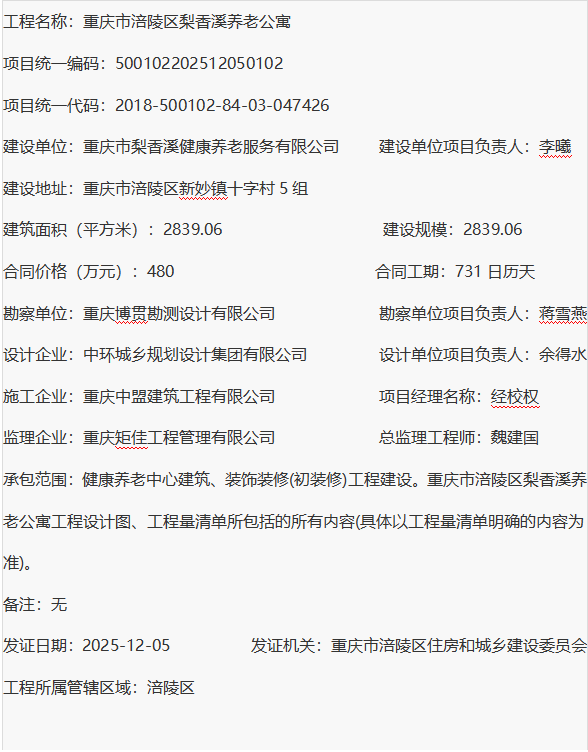 重庆市涪陵区梨香溪养老公寓 建筑工程施工许可