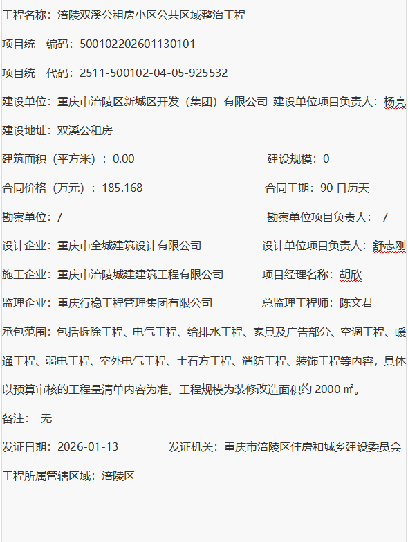 涪陵双溪公租房小区公共区域整治工程 建设工程施工许可