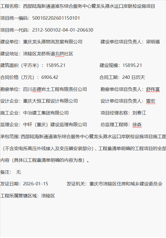 西部陆海新通道渝东综合服务中心暨龙头港水运口岸联检设施项目 建设工程施工许可