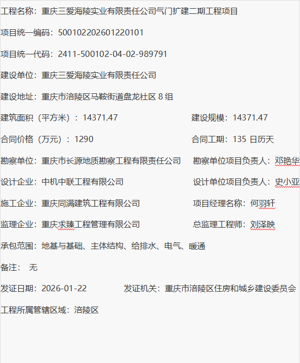 重庆三爱海陵实业有限责任公司气门扩建二期工程项目 建设工程施工许可