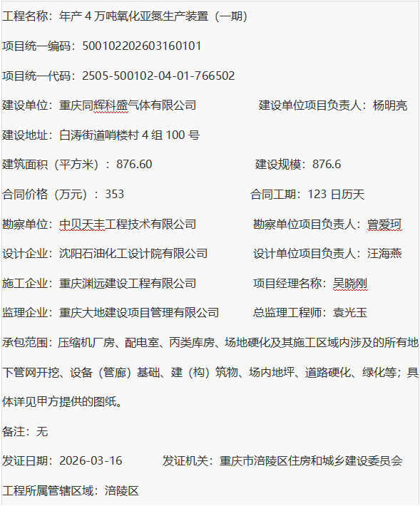年产4万吨氧化亚氮生产装置(一期) 建筑工程施工许可