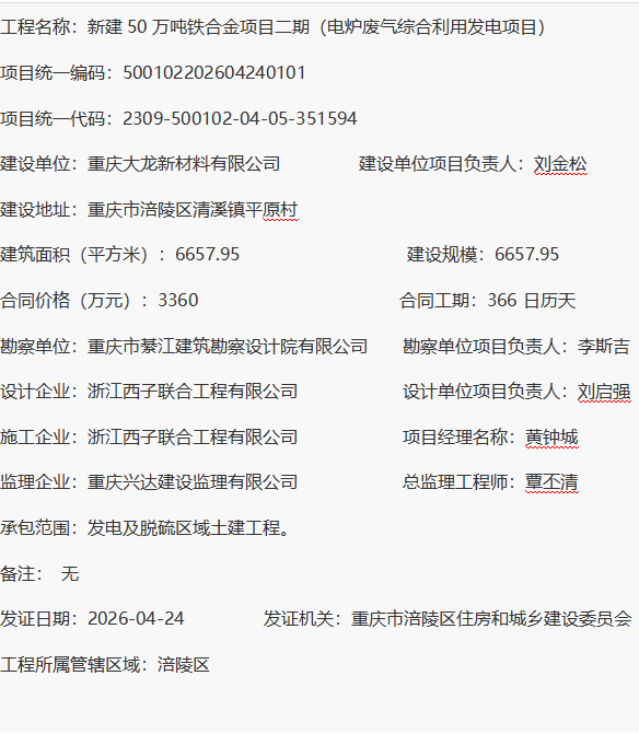 新建50万吨铁合金项目二期(电炉废气综合利用发电项目) 建筑公司施工许可