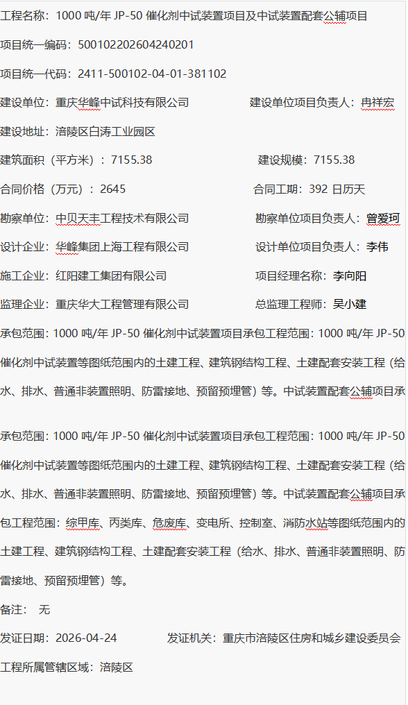 1000吨/年JP-50催化剂中试装置项目及中试装置配套公辅项目 建筑工程施工许可