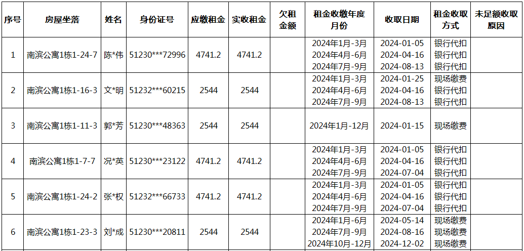 涪陵区2024年保障房租金收取情况表