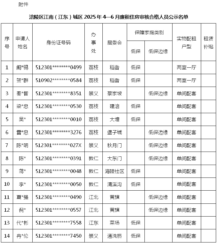附件:涪陵区江南(江东)城区2025年4—6月廉租住房审核合格人员公示名单
