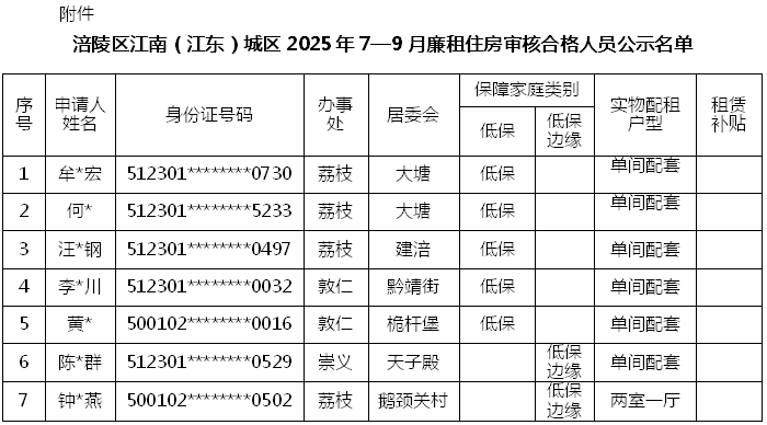 附件:涪陵区江南(江东)城区2025年7—9月廉租住房审核合格人员公示名单