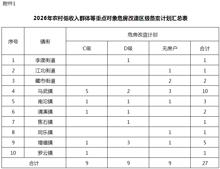 一、经区农业农村委、区民政局对各镇街申报农户的低收入群体身份进行复核,并由第三方检测机构逐户核查房屋安全等级,结合各镇街公示确认情况,共有27户(C级9户、D级9户、无房户9户)符合农村低收入群体等重点对象危房改造条件,纳入本次计划。补助标准暂定为C级每户0.75万元,D级和无房户每户3.5万元,若出新政策,补助标准按新政策执行。各镇街要采取有力措施加快推进,确保2026年2月底前全部开工,2026年5月底前全部竣工。