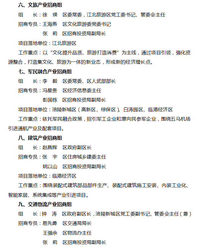 13.充实招商工作力量。根据全区产业发展调整专项招商工作组,组建数字经济产业、科创产业和高等教育产业、消费品产业、中医药产业、新材料产业、文旅产业、军民融合产业、建筑产业、交通物流产业、生物医药、医疗器械产业、商务商贸服务业、高端装备智能制造产业等12个专项招商组(见附件1),分别由区领导任组长,相关部门负责人为招商专员,相关园区为项目落地单位。重点围绕产业发展规划挖掘本行业领域招商引资线索,对接跟踪重点目标企业,做好项目洽谈、签约、落地服务等工作。(牵头单位:区委办公室、区政府办公室;责任单位:专项招商工作组、区级相关部门、各园区)