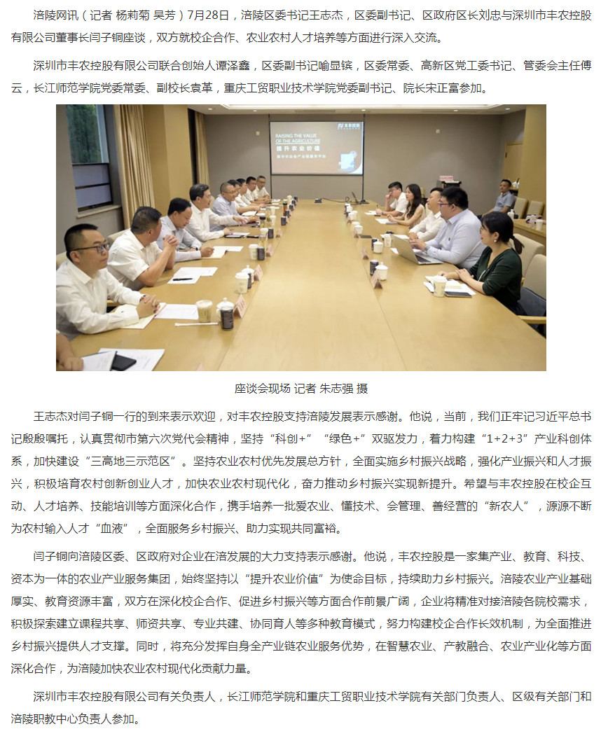 区委书记王志杰,区委副书记、区政府区长刘忠与深圳市丰农控股有限公司董事长闫子铜座谈
