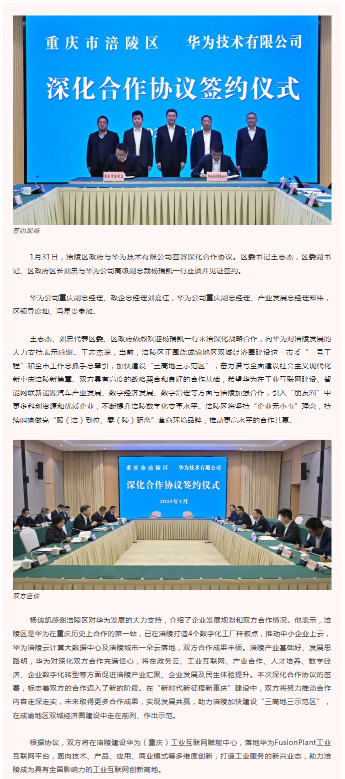 涪陵区与华为公司签署深化合作协议 王志杰刘忠与杨瑞凯一行座谈并见证签约