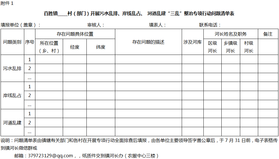 1.百胜镇___村(部门)开展污水乱排、岸线乱占、河道乱建“三乱”整治专项行动问题清单表