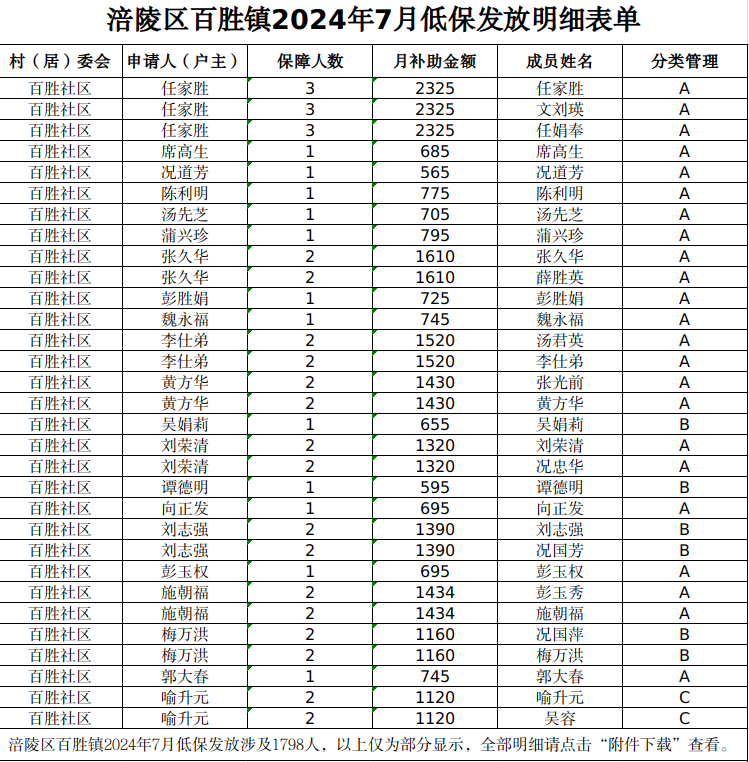 涪陵区百胜镇2024年7月低保人员新增、调减、停发公示及个人发放明细表