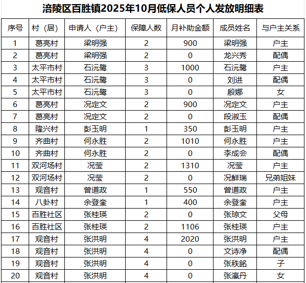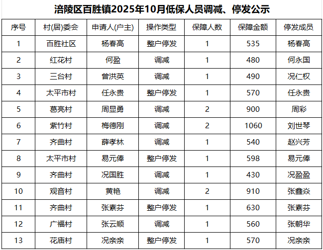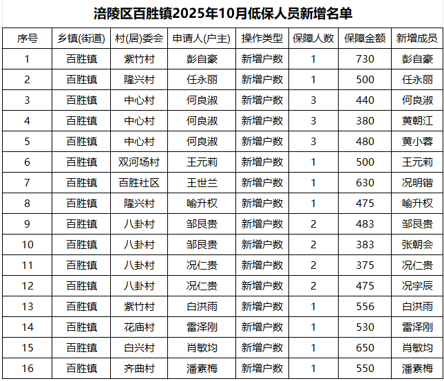 涪陵区百胜镇2025年10月低保人员新增、调减、停发公示及个人发放明细表