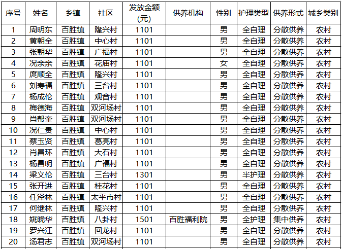 涪陵区百胜镇2025年12月特困人员救助供养金发放明细表