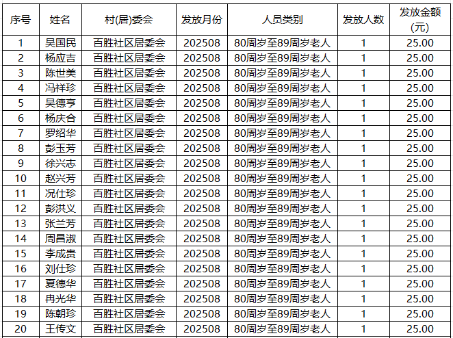 涪陵区百胜镇2025年8月高龄津贴发放情况