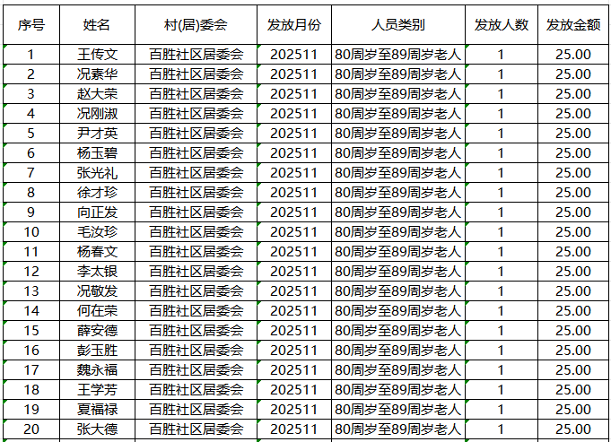 涪陵区百胜镇2025年11月高龄津贴发放情况