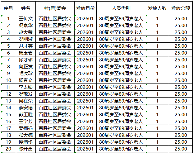 涪陵区百胜镇2026年1月高龄津贴发放情况