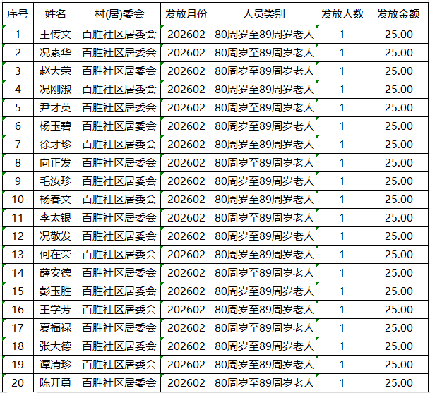 涪陵区百胜镇2026年2月高龄津贴发放情况