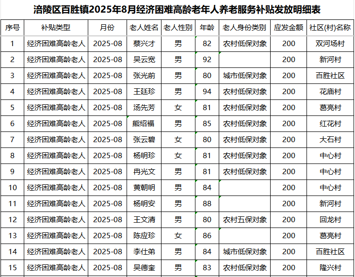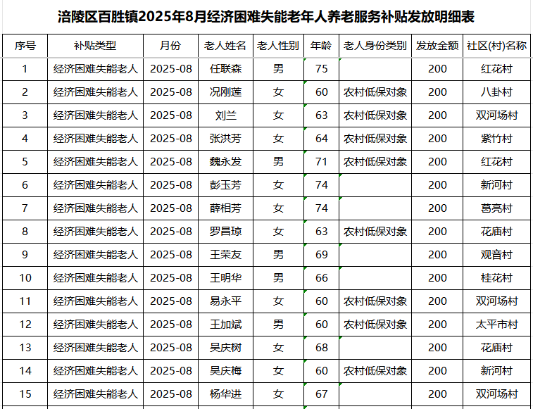 涪陵区百胜镇2025年8月经济困难高龄、失能老年人养老服务补贴发放明细表