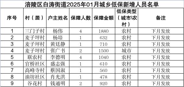 涪陵区白涛街道2025年1月城乡低保新增、停发和调整人员及个人发放明细表