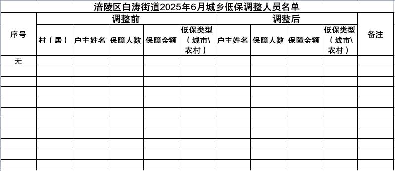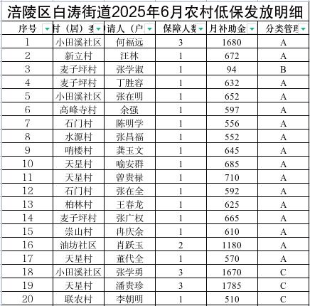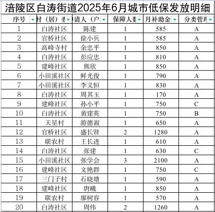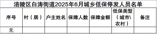 涪陵区白涛街道2025年6月城乡低保新增、停发和调整人员及个人发放明细表