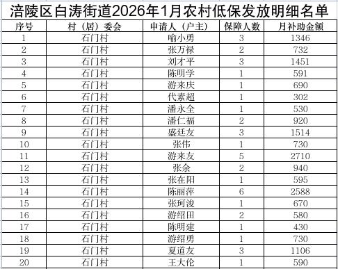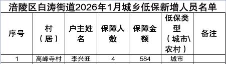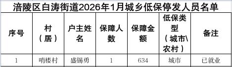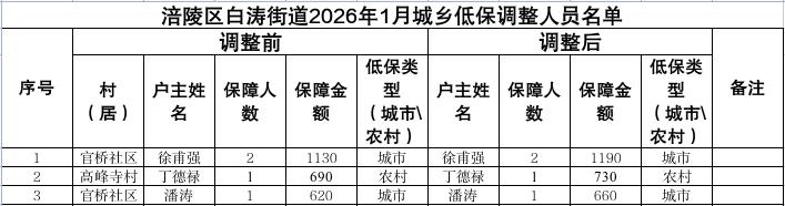 涪陵区白涛街道2026年1月城乡低保新增、停发和调整人员及个人发放明细表
