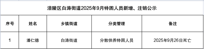 涪陵区白涛街道2025年9月特困人员新增、注销公示