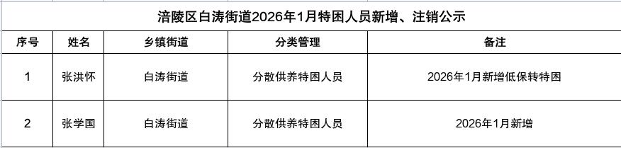 涪陵区白涛街道2026年1月特困人员新增、注销公示