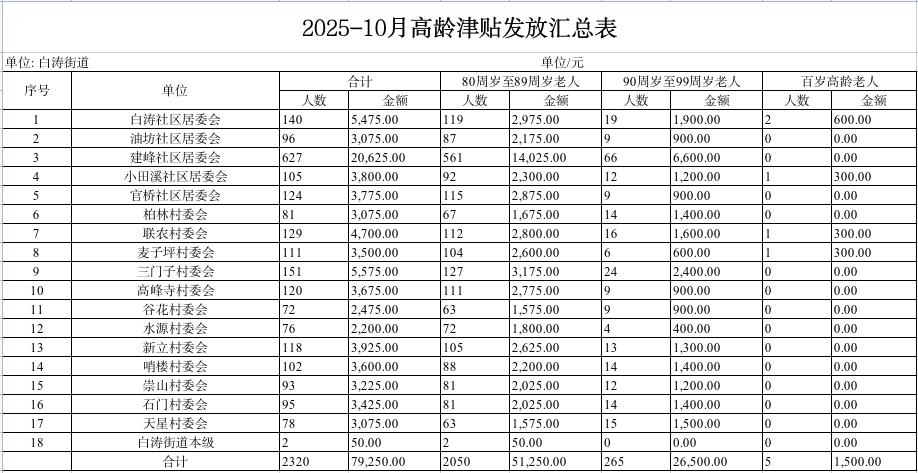 涪陵区白涛街道高龄津贴发放情况(2025年10月)