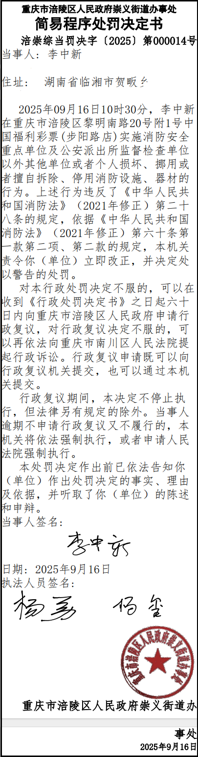 重庆市涪陵区人民政府崇义街道办事处简易程序处罚决定书