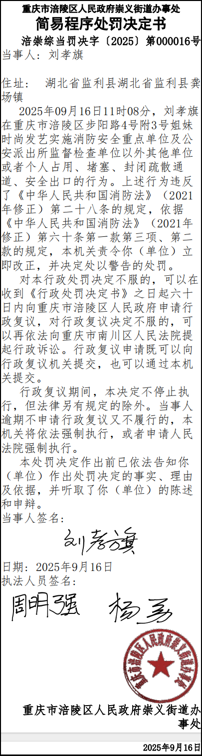 重庆市涪陵区人民政府崇义街道办事处简易程序处罚决定书