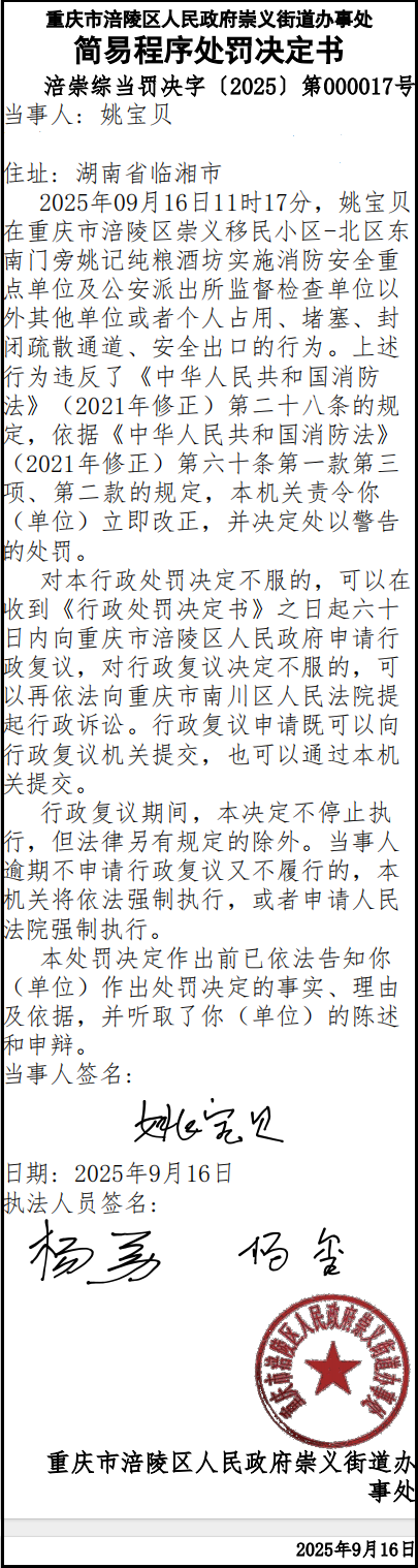 重庆市涪陵区人民政府崇义街道办事处简易程序处罚决定书