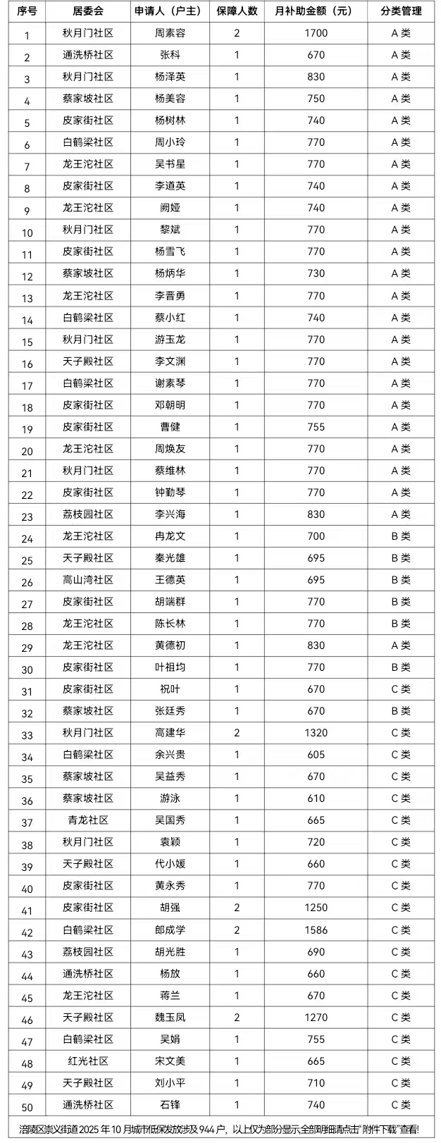 涪陵区崇义街道2025年10月城市低保个人发放明细表