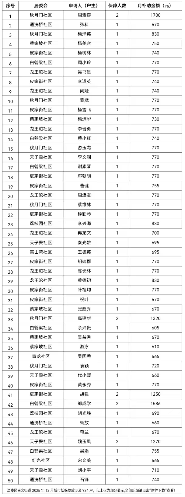 涪陵区崇义街道2025年12月城市低保个人发放明细表