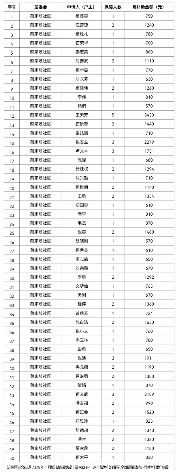 涪陵区崇义街道2026年1月城市低保个人发放明细表
