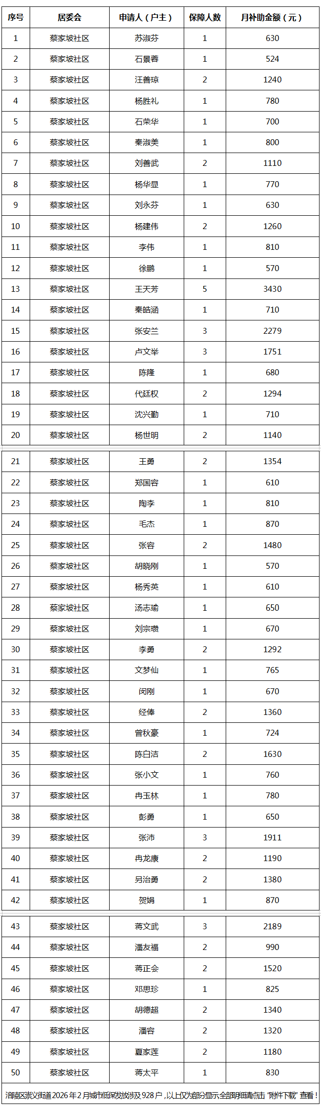 涪陵区崇义街道2026年2月城市低保个人发放明细表